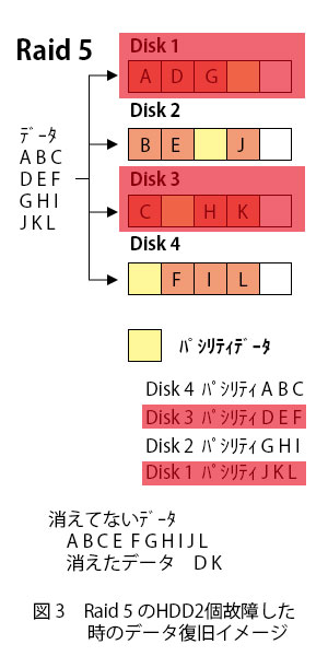 Raid 5はハードディスクが4台構成の場合、1台が障害が起こっても他の3台が正常であればデータを修復できます。2台以上が故障した時には修復はできなくなります。復旧できない原因は図3で説明させていただきますと、Disk 1とDisk 3が故障した場合、Disk 2からデータB・データE・データJ・パシリティにデータG・データH・データIと Disk 4からデータF・データI・データL・パシリティにデータA・データB・データCはデータは残っていますが、データDとデータKは消えたままとなります。また、4台のうち2台が故障しますとRaid構成が認識できなくなりますので、